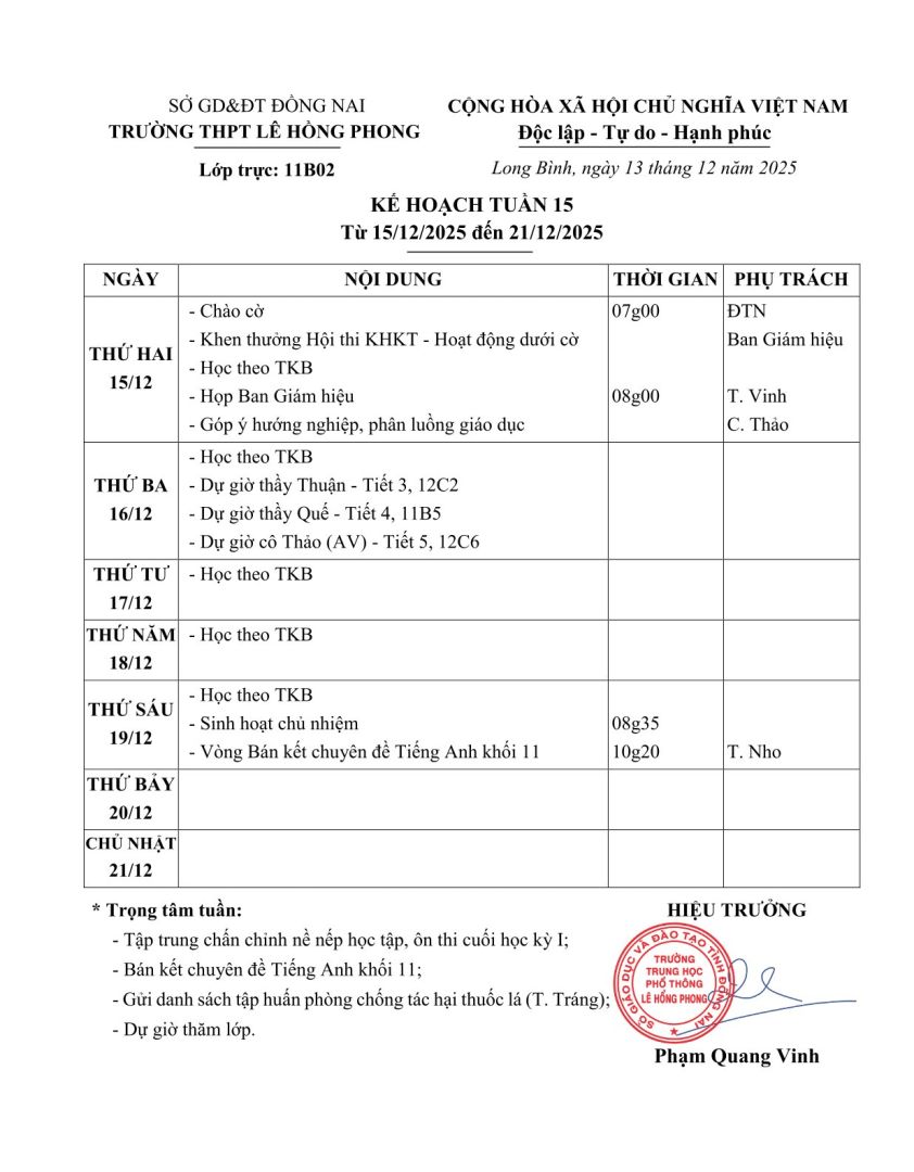 Kế hoạch Tuần 15 (15/12 => 21/12/2025)