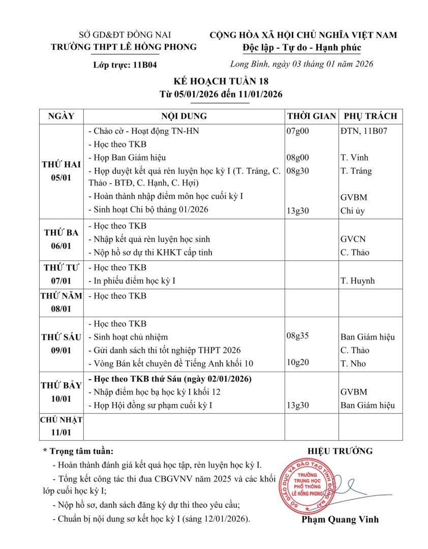 Kế hoạch Tuần 18 (05/01 => 11/01/2026)