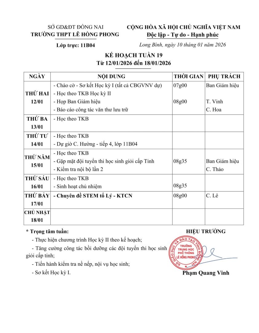 Kế hoạch Tuần 19 (12/01 => 18/01/2026)