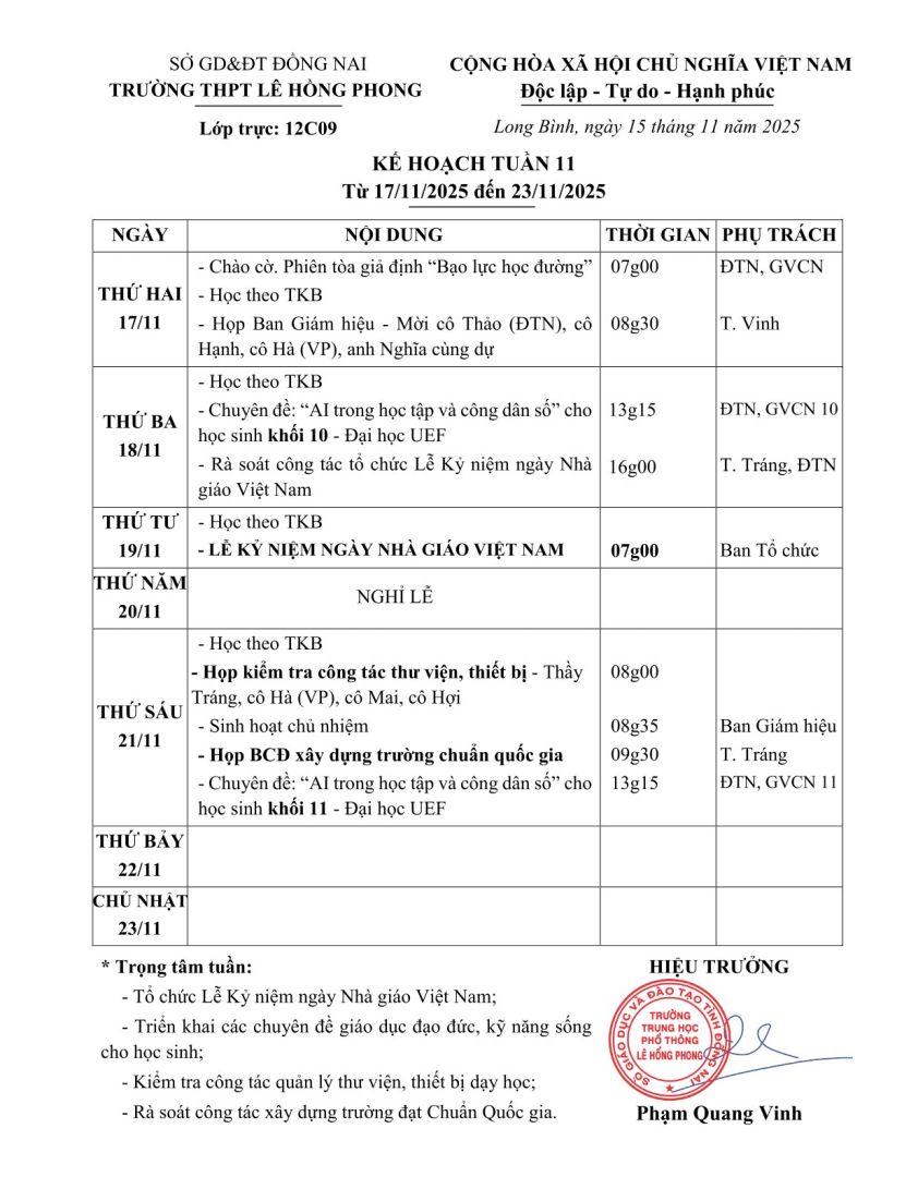 Kế hoạch Tuần 11 (16/11 => 23/11/2025)