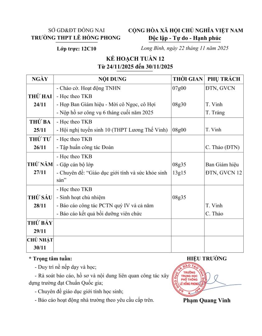 Kế hoạch Tuần 12 (24/11 => 30/11/2025)