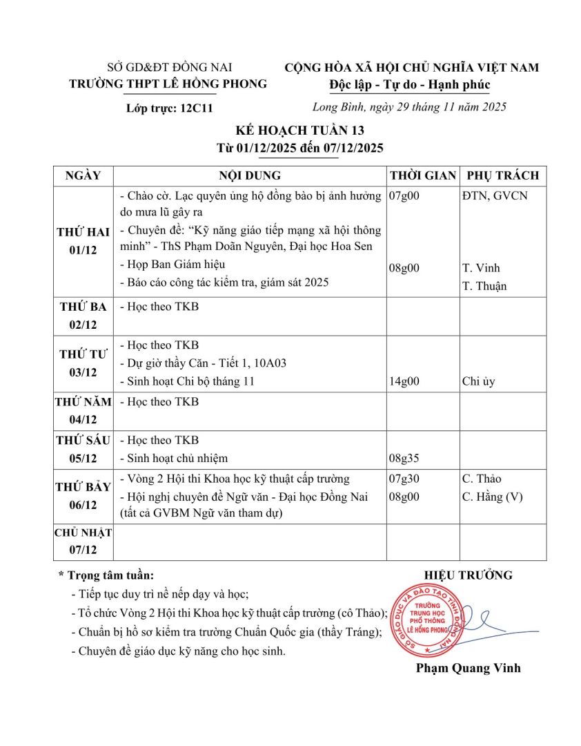 Kế hoạch Tuần 13 (01/12 => 07/12/2025)