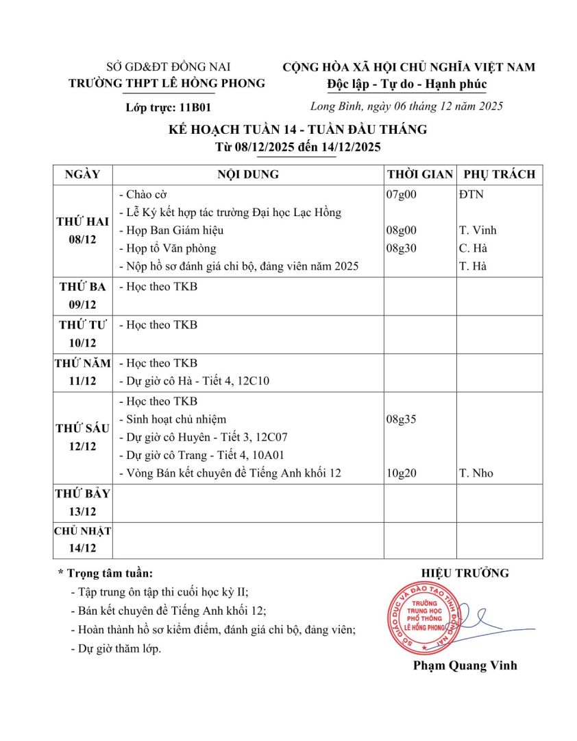 Kế hoạch Tuần 14 (08/12 => 14/12/2025)